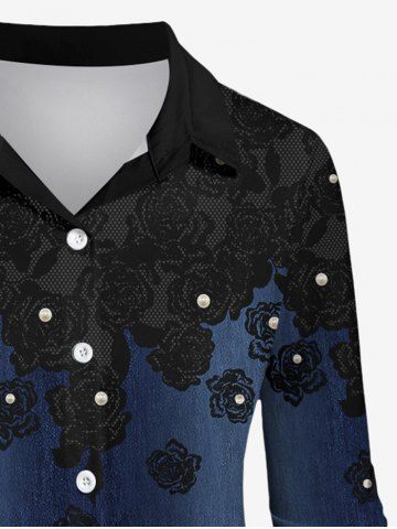 Plus Size Floral Appliques Crystal Denim 3D Print Button Down Shirt - Deep Blue - 5x