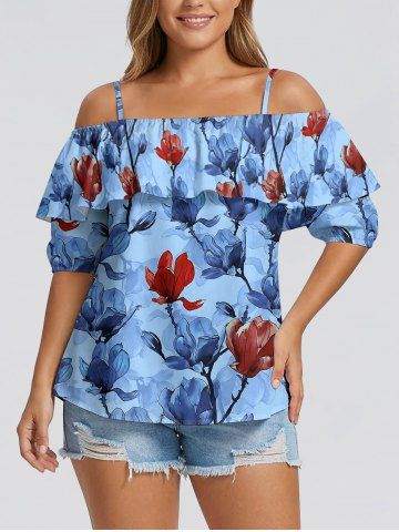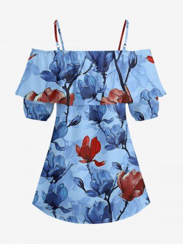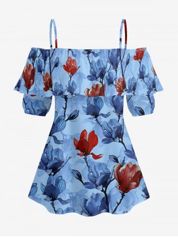Graphic Blouses > Plus Size Flower Branch Print Hawaii Cold Shoulder Ruffles Blouse