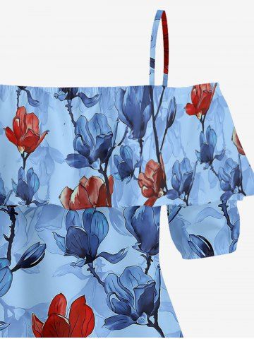 Graphic Blouses > Plus Size Flower Branch Print Hawaii Cold Shoulder Ruffles Blouse