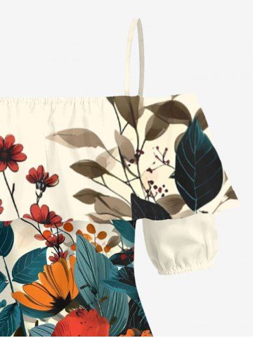 Graphic Blouses > Plus Size Flower Leaf Branch Print Hawaii Cold Shoulder Ruffles Blouse