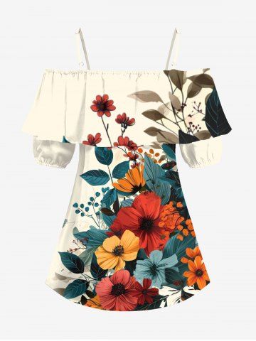 Graphic Blouses > Plus Size Flower Leaf Branch Print Hawaii Cold Shoulder Ruffles Blouse