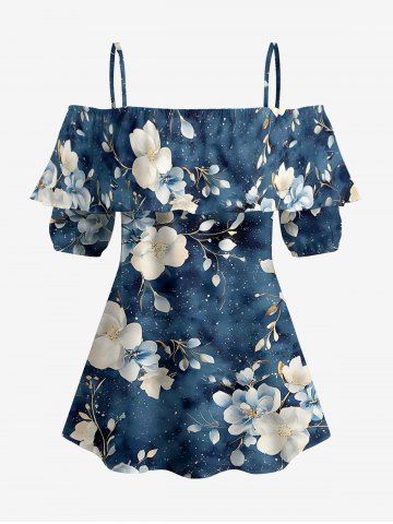Plus Size Flower Leaf Branch Print Hawaii Cold Shoulder Ruffles Blouse - Deep Blue - 5xl
