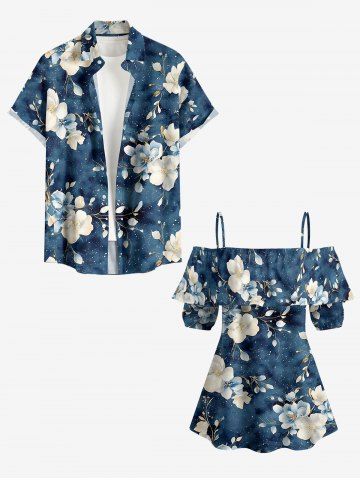 Graphic Blouses > Plus Size Flower Leaf Branch Print Hawaii Cold Shoulder Ruffles Blouse