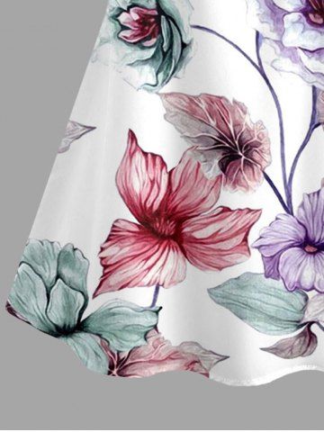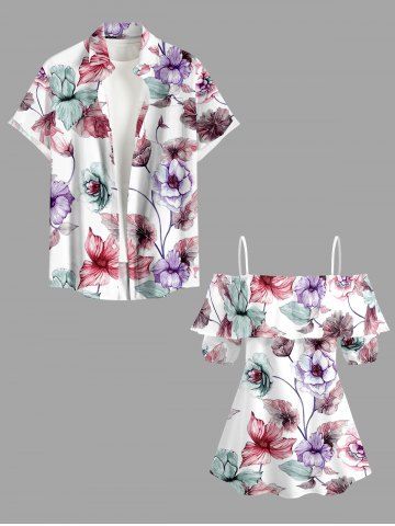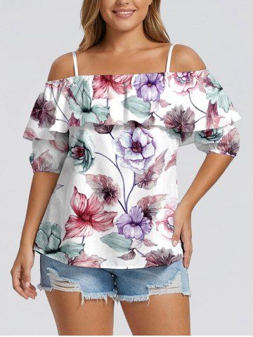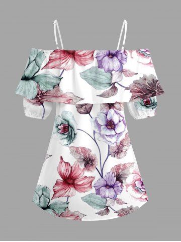 Plus Size Flower Leaf Branch Print Hawaii Cold Shoulder Ruffles Blouse - White - L