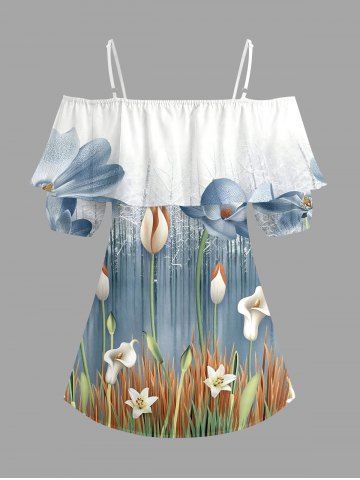 Plus Size Flower Plant Print Hawaii Ruffles Cold Shoulder Blouse - Blue Gray - M