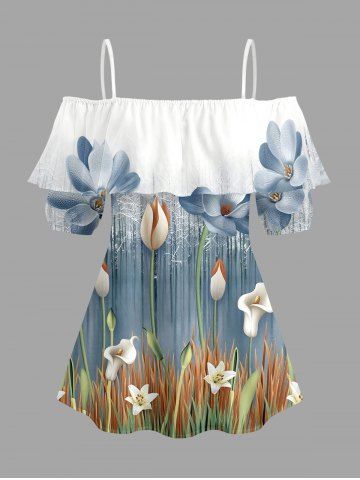 Plus Size Flower Plant Print Hawaii Ruffles Cold Shoulder Blouse - Blue Gray - 4xl