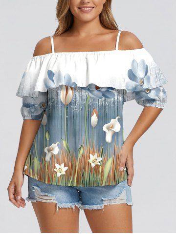 Plus Size Flower Plant Print Hawaii Ruffles Cold Shoulder Blouse - Blue Gray - 5xl