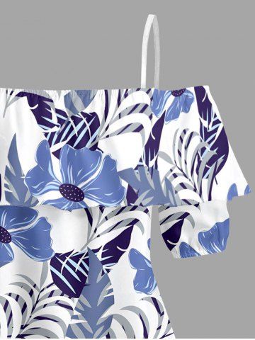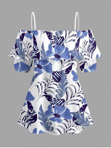 Plus Size Flowers Tropical Leaf Print Cold Shoulder Ruffles Cover Hawaii Blouse - Sky Blue - S