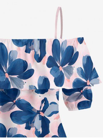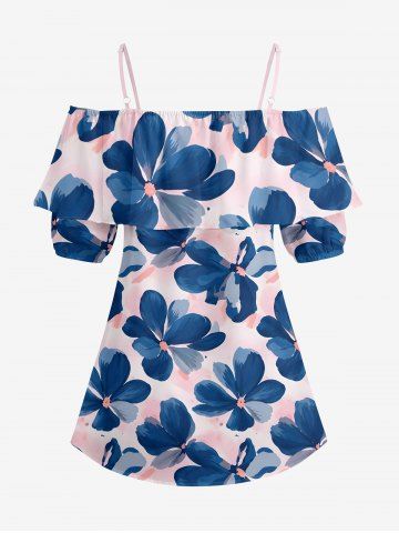 Plus Size Flowers Watercolor Print Cold Shoulder Ruffles Cover Hawaii Blouse - Pink - 2xl