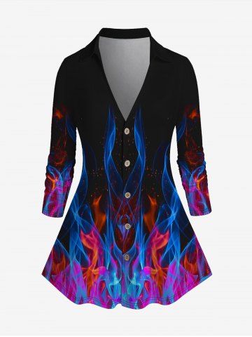 Graphic Blouses > Plus Size Long Sleeves Flame Printed Plunging Shirt