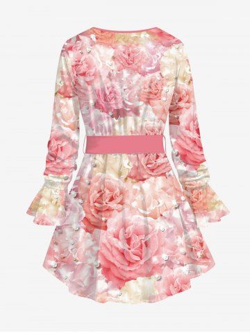 Plus Size Poet Sleeves 3D Glitter Sparkling Rhinestone Faux Pearl Ombre Rose Flower Print Blouse with Tied Belt - Light Pink - L
