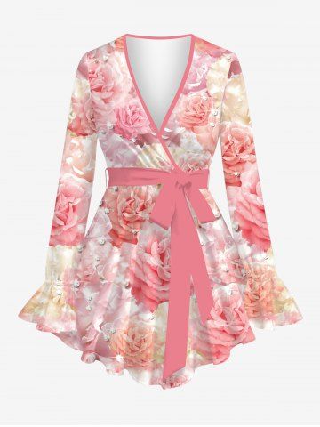 Plus Size Poet Sleeves 3D Glitter Sparkling Rhinestone Faux Pearl Ombre Rose Flower Print Blouse with Tied Belt - Light Pink - 5x