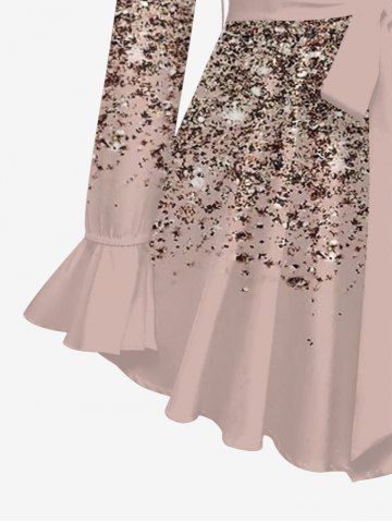 Plus Size Poet Sleeves 3D Glitter Sparkling Sequins Print Long Sleeves Blouse with Tied Belt - Light Pink - 3x