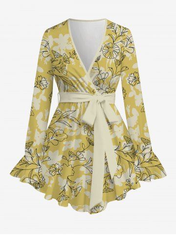 Plus Size Poet Sleeves Floral Leaf Print Shirt with Tied Belt - Deep Yellow - 4x
