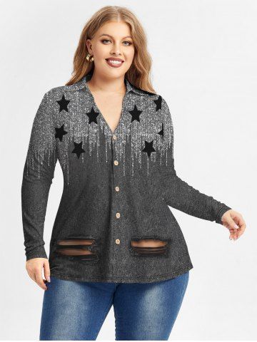 Graphic Blouses > Plus Size Star 3D Ripped Print Sparkly Glitter Shirt