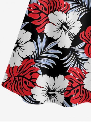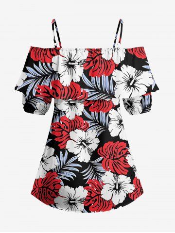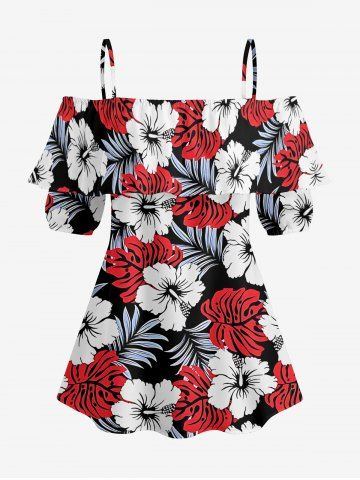 Plus Size Tropical Leaf Hibiscus Flower Print Hawaii Cold Shoulder Ruffles Blouse - Red - S