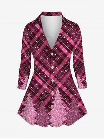 Graphic Blouses > Plus Size Turn-down Collar Glitter Sparkling Christmas Tree Snowflake Plaid Print Buttons Long Sleeves Shirt
