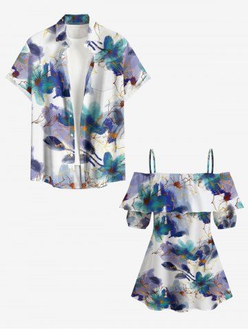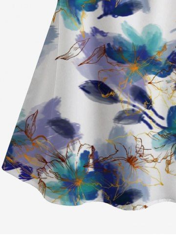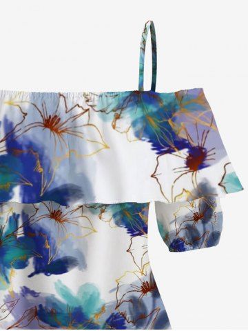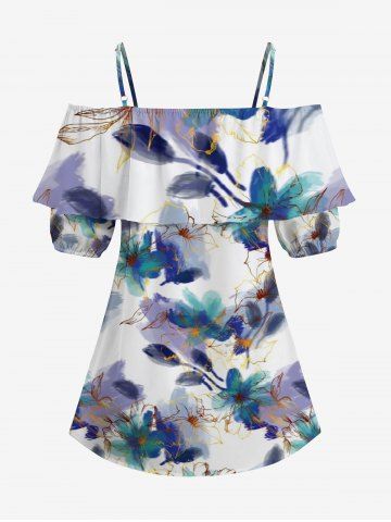 Graphic Blouses > Plus Size Watercolor Painting Flower Print Hawaii Cold Shoulder Ruffles Blouse