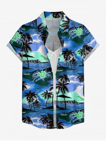 Women's Coconut Tree Sea Hibiscus Flower Print Hawaii Shirt - Navy Blue - S