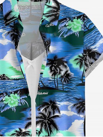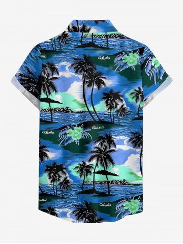 Women's Coconut Tree Sea Hibiscus Flower Print Hawaii Shirt - Navy Blue - L