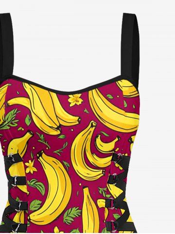 Banana Flower Leaf Print Hawaii Lace Up A Line Dress - Red Wine - Xs