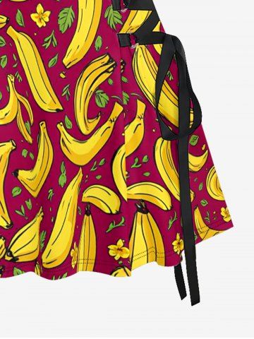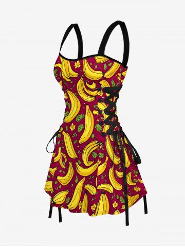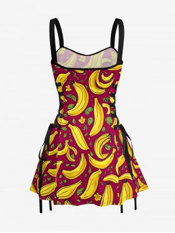 Banana Flower Leaf Print Hawaii Lace Up A Line Dress - Red Wine - M