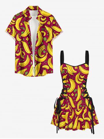 Banana Flower Leaf Print Hawaii Lace Up A Line Dress - Red Wine - Xxxl