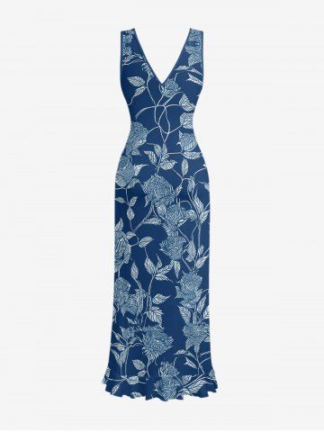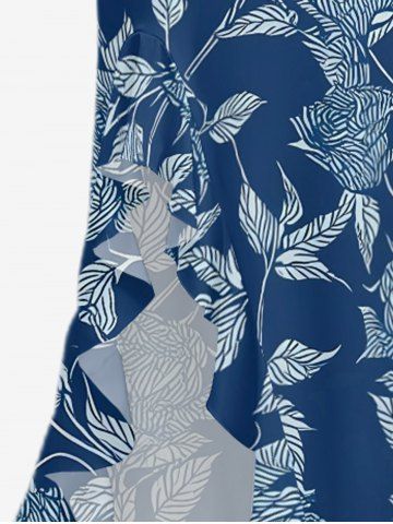 Branch Leaf Flower Print Hawaii Ruffles Split Dress - Deep Blue - M