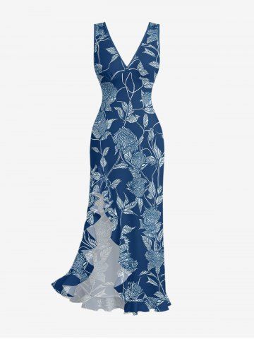 Branch Leaf Flower Print Hawaii Ruffles Split Dress - Deep Blue - Xl