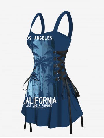 Coconut Tree Ombre Colorblock Print Lace Up Hawaii Tank Dress - Deep Blue - S