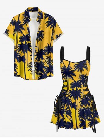 Coconut Tree Print Hawaii Lace Up A Line Dress - Yellow - Xs
