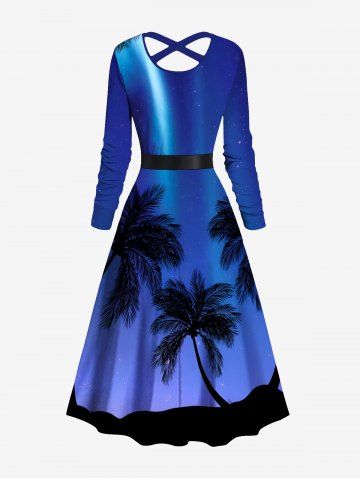 Coconut Tree Star Glitter 3D Print Crisscross Hawaii Dress With A Belt - Blue - 3xl