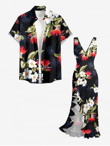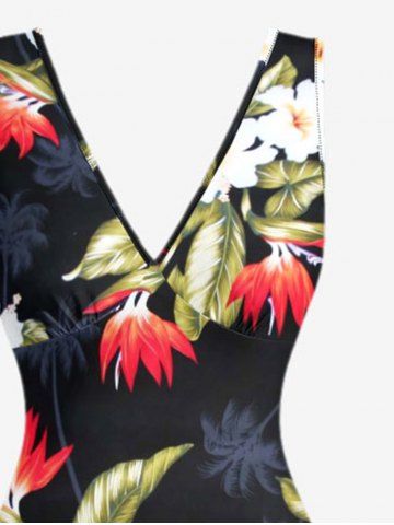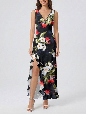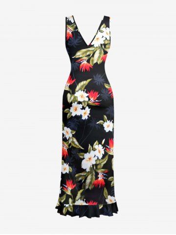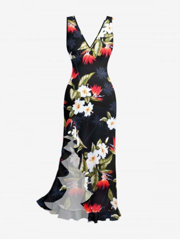 Coconut Tree Tropical Leaf Hibiscus Flower Print Hawaii Ruffles Split Dress - Black - M
