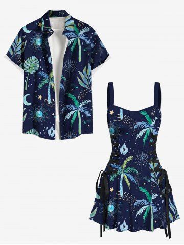 Coconut Tree Tropical Leaf Sun Moon Eye Print Hawaii Lace Up A Line Dress - Navy Blue - S