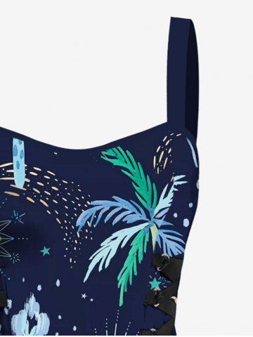 Coconut Tree Tropical Leaf Sun Moon Eye Print Hawaii Lace Up A Line Dress - Navy Blue - L