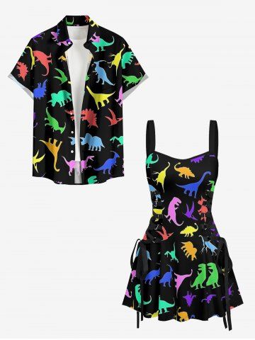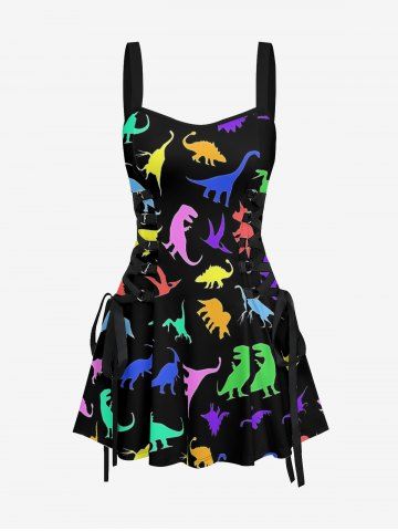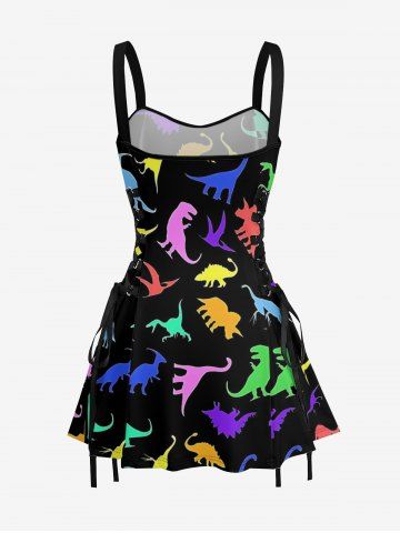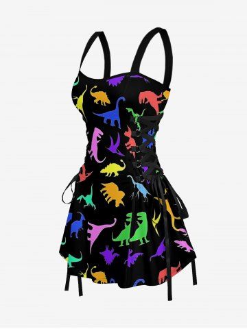 Colorful Dinosaur Print Hawaii Lace Up A Line Dress - Black - Xs