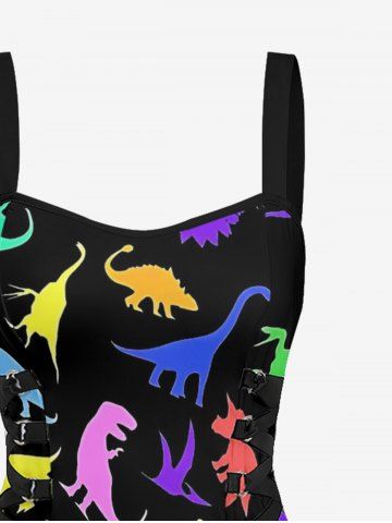 Colorful Dinosaur Print Hawaii Lace Up A Line Dress - Black - Xxl
