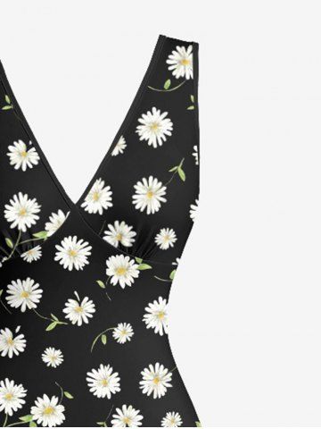 Daisy Flower Print Hawaii Ruffles Split Dress - Black - Xs