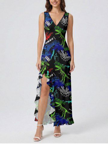 Dinosaur Letters Print Hawaii Ruffles Split Dress - Black - L