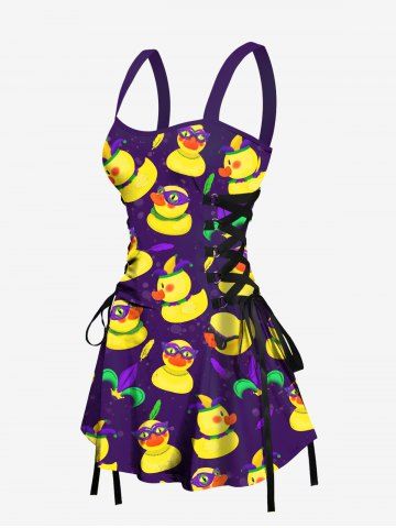 Ducks Clawn's Hat Feather Print Lace Up Hawaii Tank Dress - Concord - S