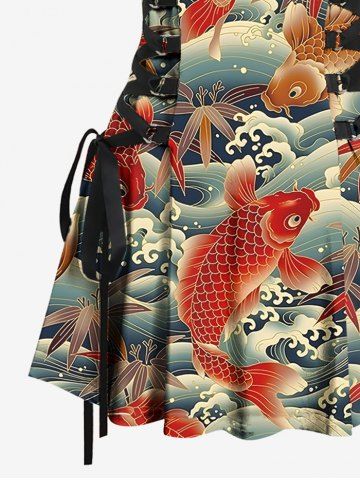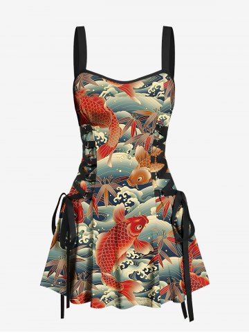 Fish Sea Waves Leaf Print Lace Up Hawaii Tank Dress - Red - L