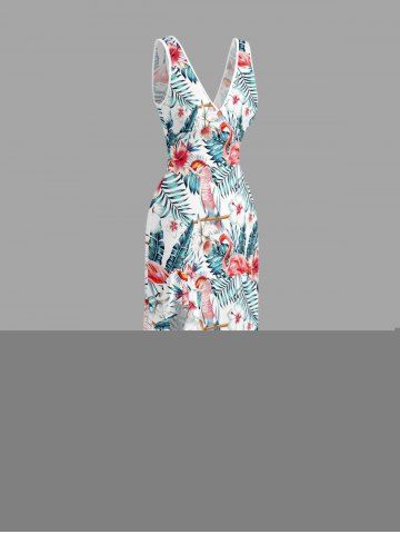 Graphic Dresses > Flamingo Parrot Hibiscus Flowers Leaf Print Hawaii Ruffles Split Surplice Dress