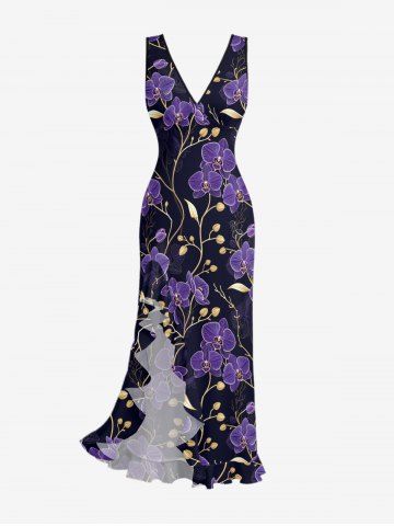 Flower Branch Print Hawaii Ruffles Split Dress - Concord - M