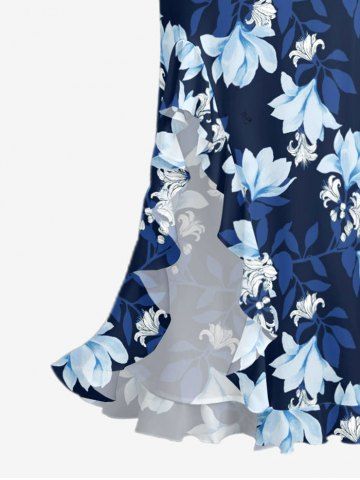 Flower Leaf Branch Print Hawaii Ruffles Split Dress - Deep Blue - Xs