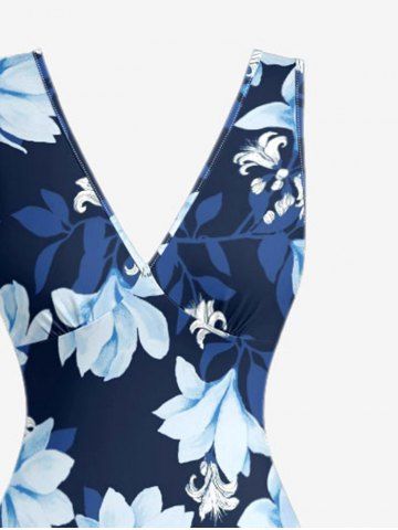 Flower Leaf Branch Print Hawaii Ruffles Split Dress - Deep Blue - S