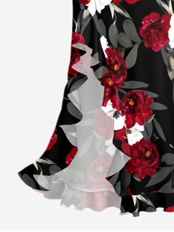 Flower Leaf Branch Print Hawaii Ruffles Split Dress - Black - M