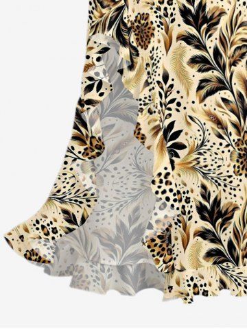 Flower Leaf Leopard Print Hawaii Ruffles Split Dress - Light Coffee - Xs