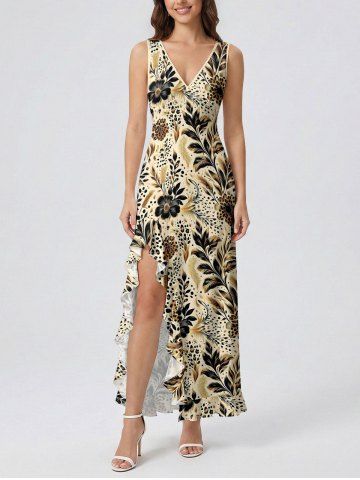 Graphic Dresses > Flower Leaf Leopard Print Hawaii Ruffles Split Dress