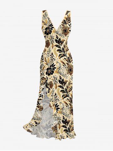 Flower Leaf Leopard Print Hawaii Ruffles Split Dress - Light Coffee - S