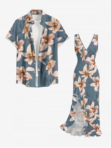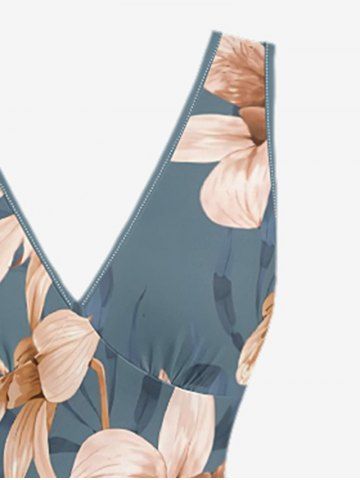 Flower Leaf Print Hawaii Ruffles Split Dress - Blue - M